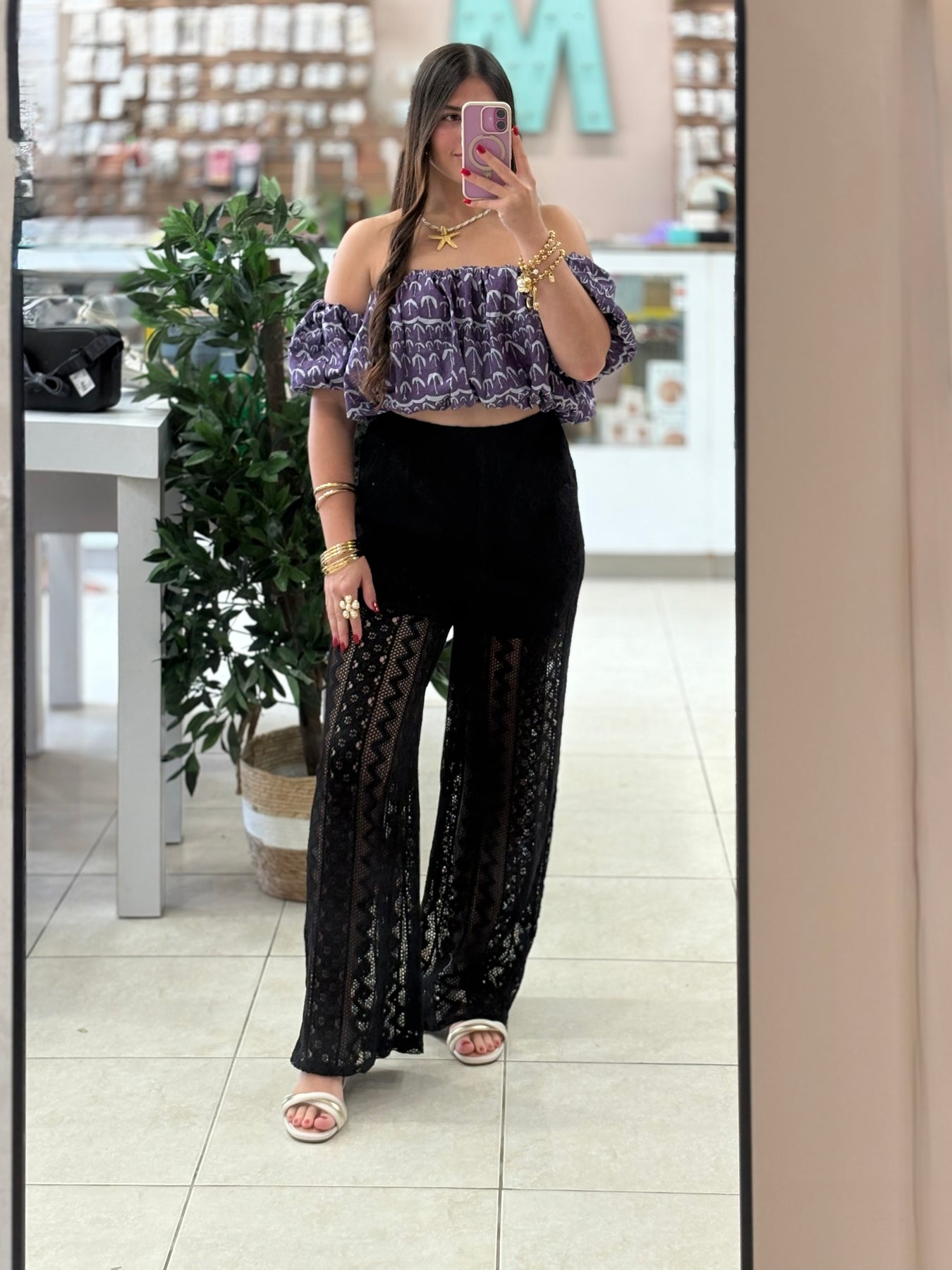 Elevate your style with our Boho Lace Pant! Made with a stunning black lace design, these pants will add a touch of sophistication to any outfit. Perfect for a night out or a special occasion, these pants are a must-have for any fashion-forward individual. Don't just wear clothes, make a statement with our Boho Lace Pant!