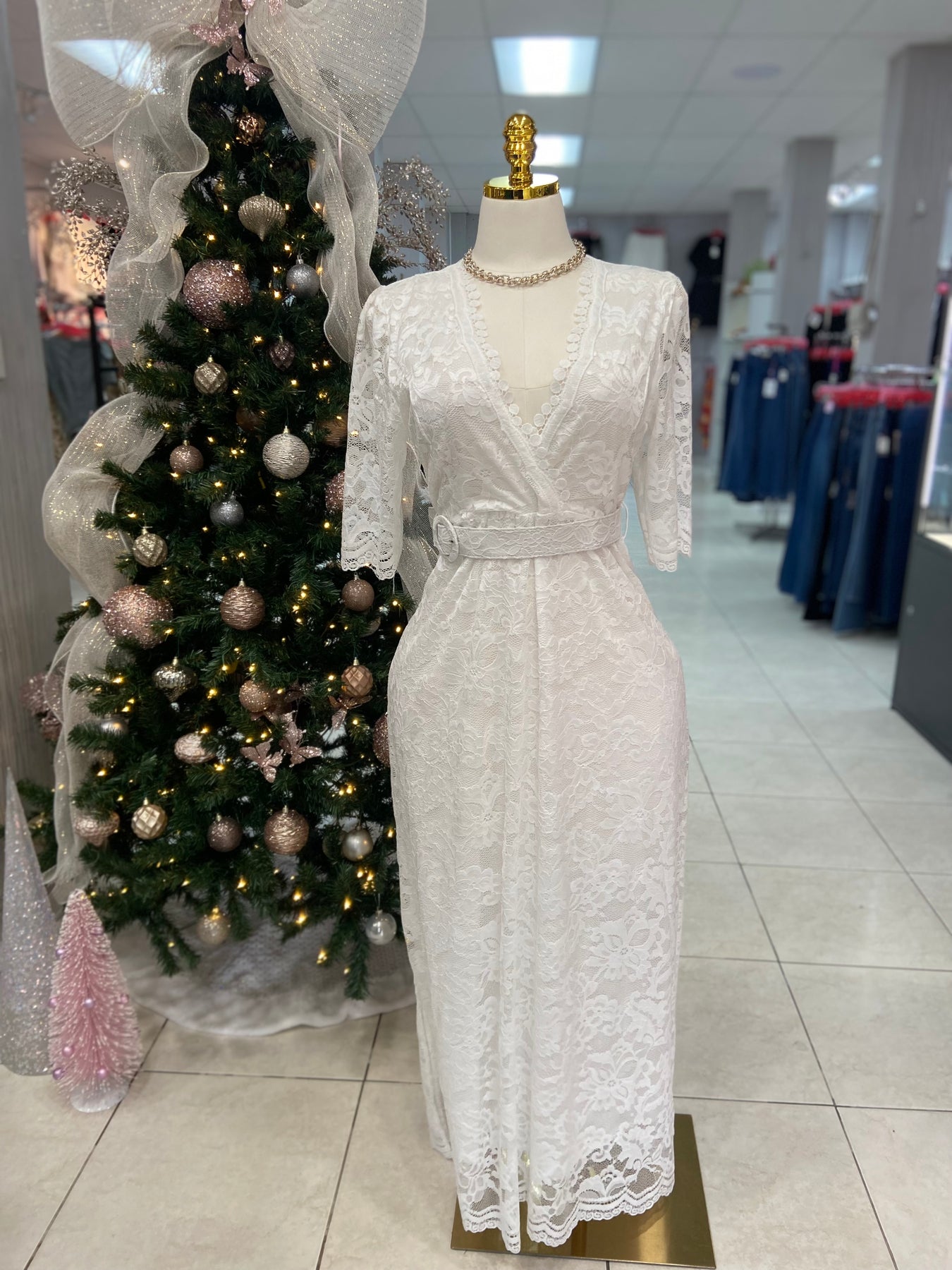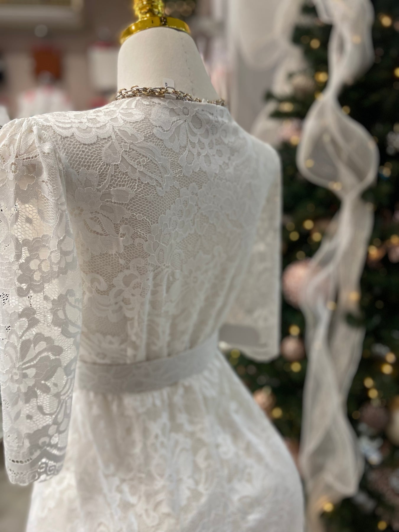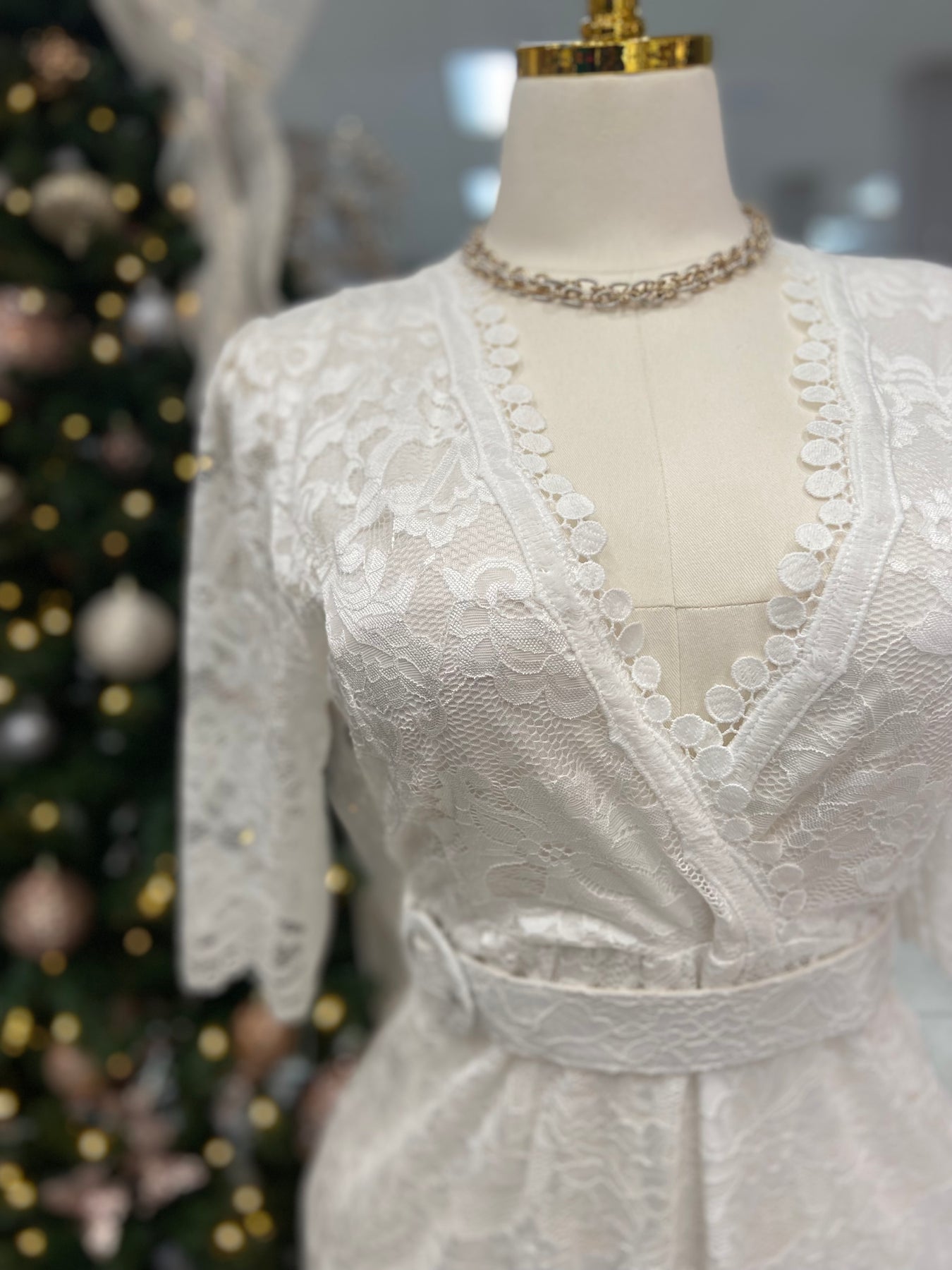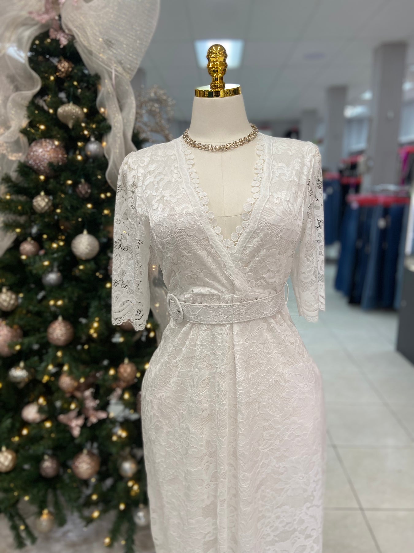 Experience elegance and grace in our Madonna Dress. This gorgeous lace white dress will make you feel like a true queen with its stunning design. Perfect for any special occasion, this dress exudes sophistication and beauty. Elevate your style with our Madonna Dress.