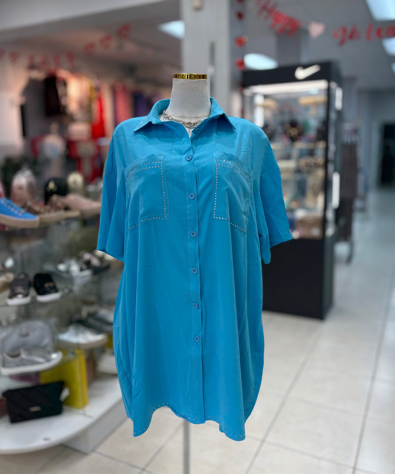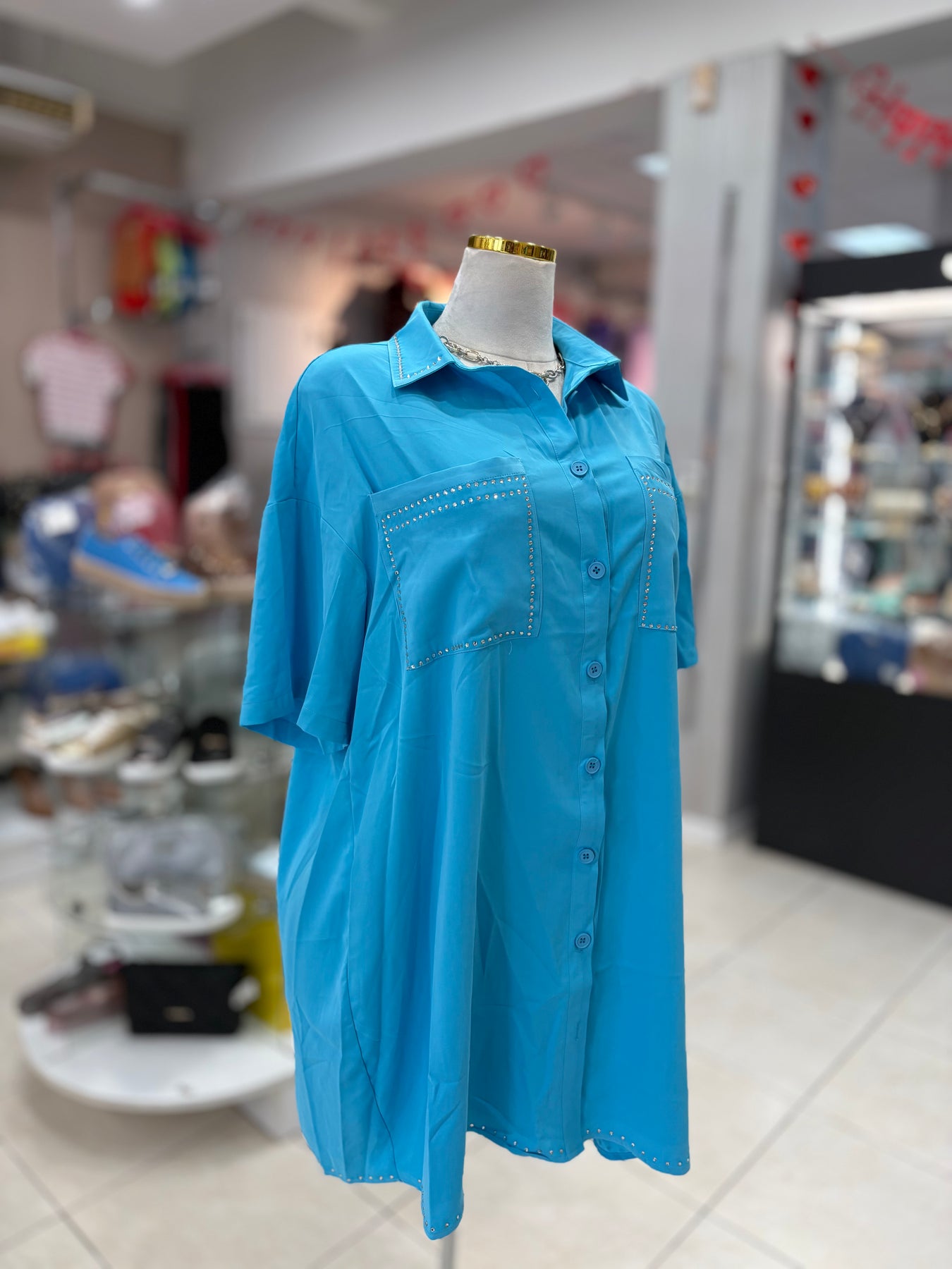 Embrace your unique style with the Stardust Dress! This plus-size button-down dress combines comfort with flair, featuring pockets for practicality and exquisite rhinestones that add a touch of sparkle. Feel confident and radiant wherever you go—let your personality shine through every detail!