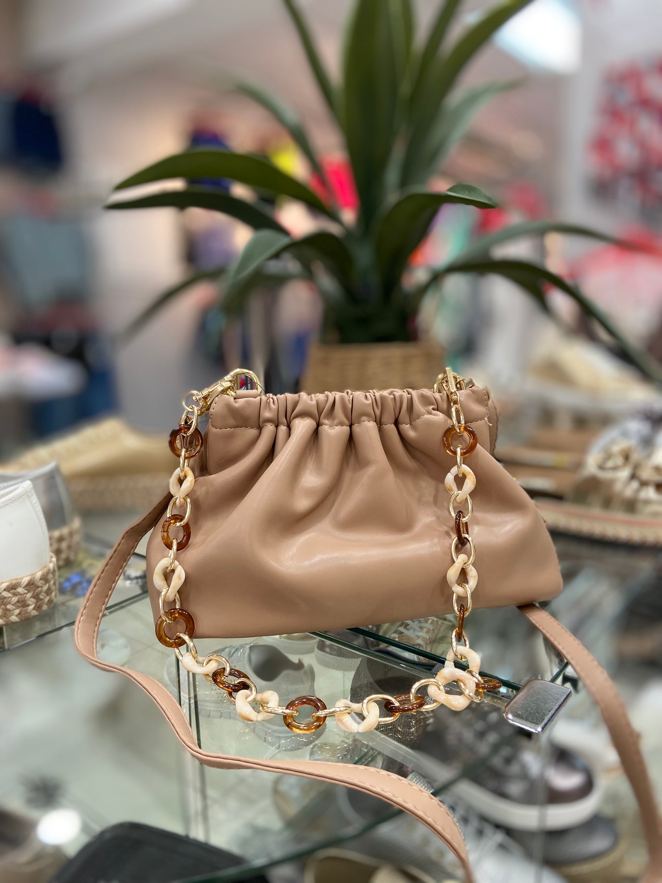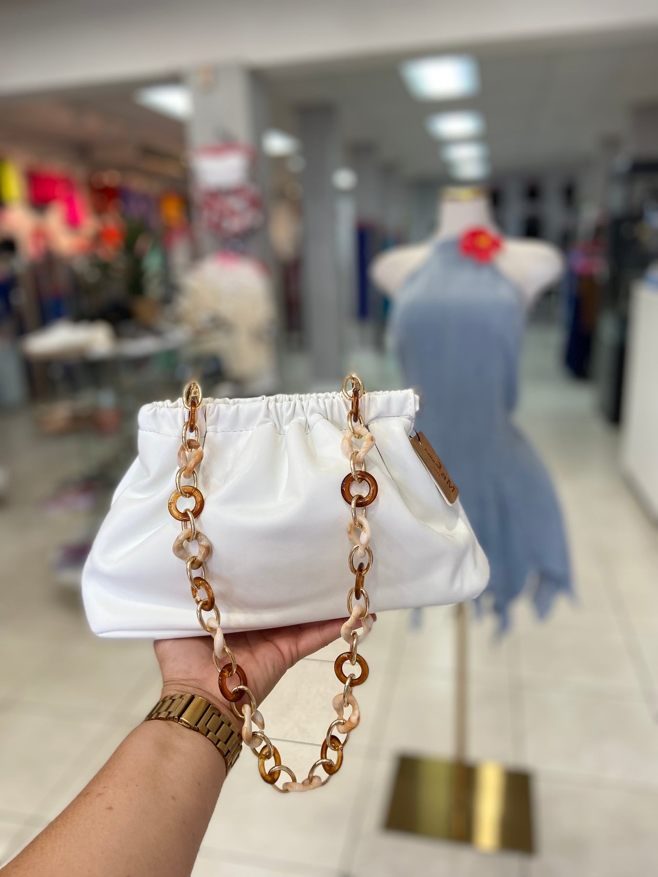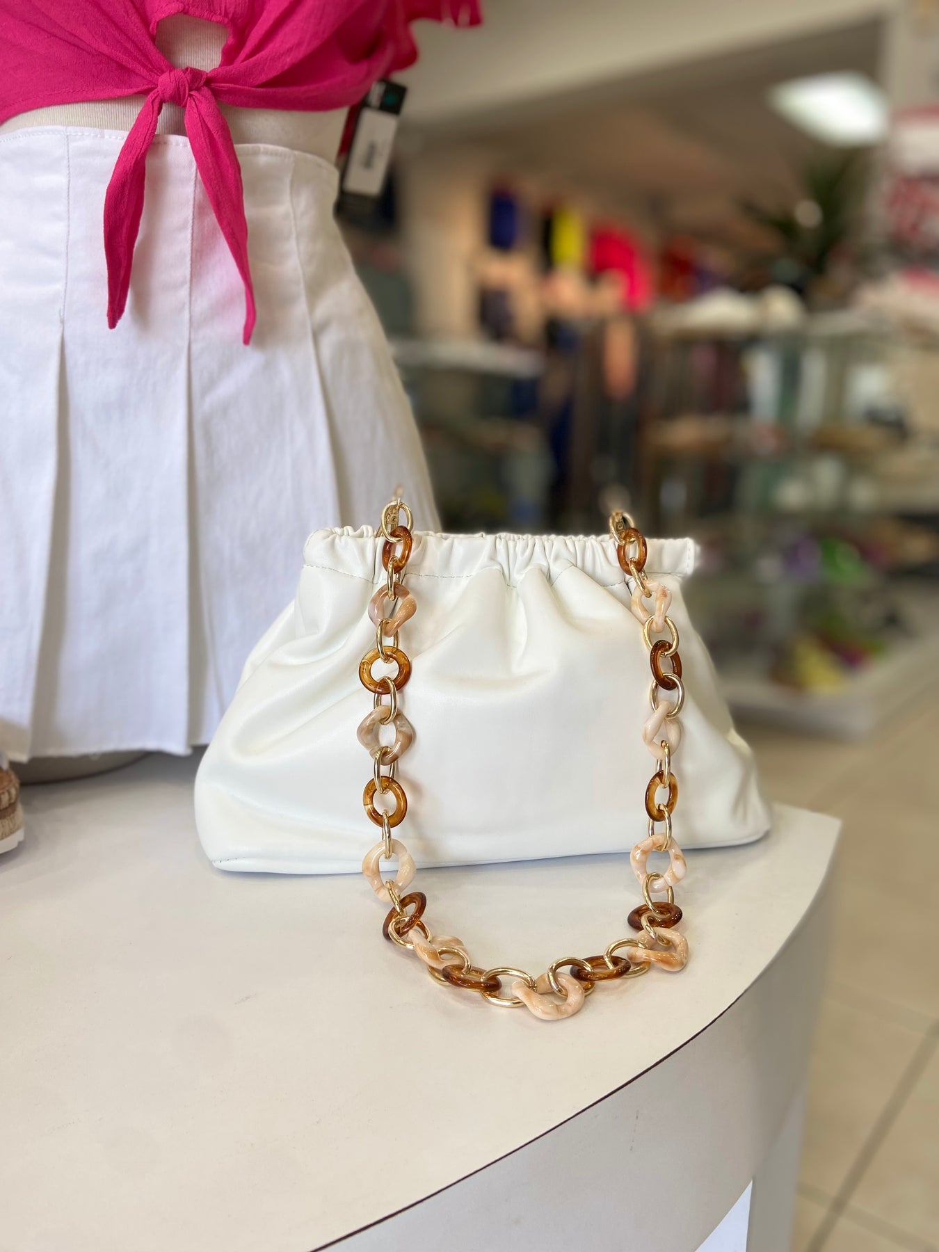 "The Kim Chain Clutch is a versatile and stylish handbag, available in three stunning colors - red, beige, and white. It offers multiple ways of use, with a long strap, a regular strap, or as a clutch. Elevate your outfit with this must-have accessory!"