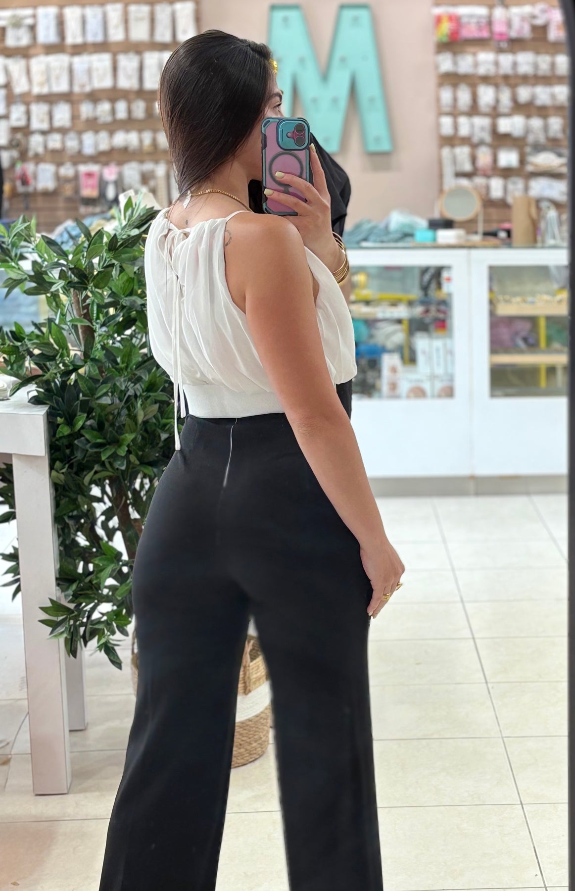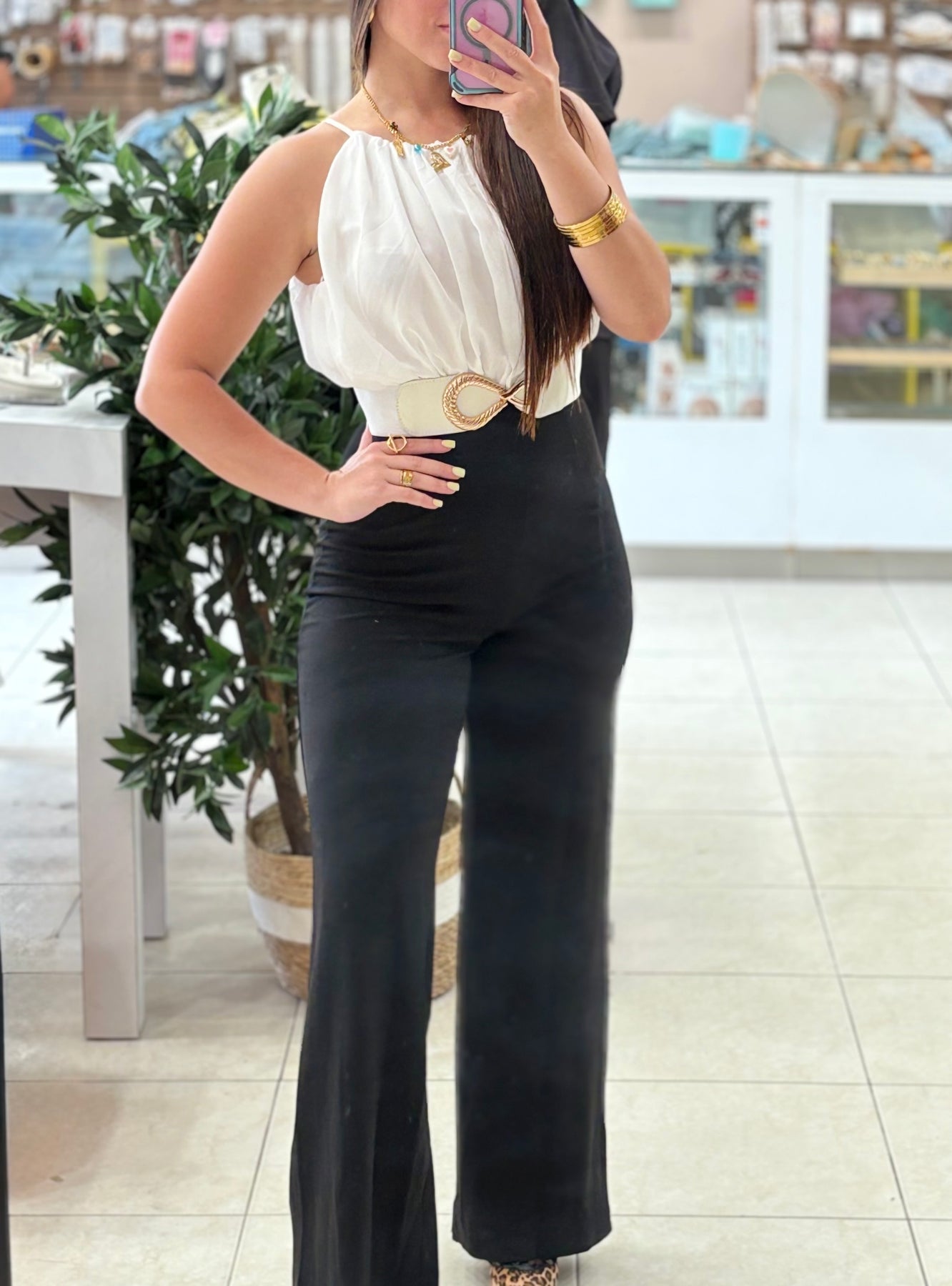 The Grace Jumpsuit is the perfect combination of elegance and style. The white top contrasts beautifully with the black bottom, and the zipper in the back adds a touch of modern flair. With stretchy pants, this jumpsuit is comfortable and versatile for any occasion. Look and feel stunning in the Grace Jumpsuit.