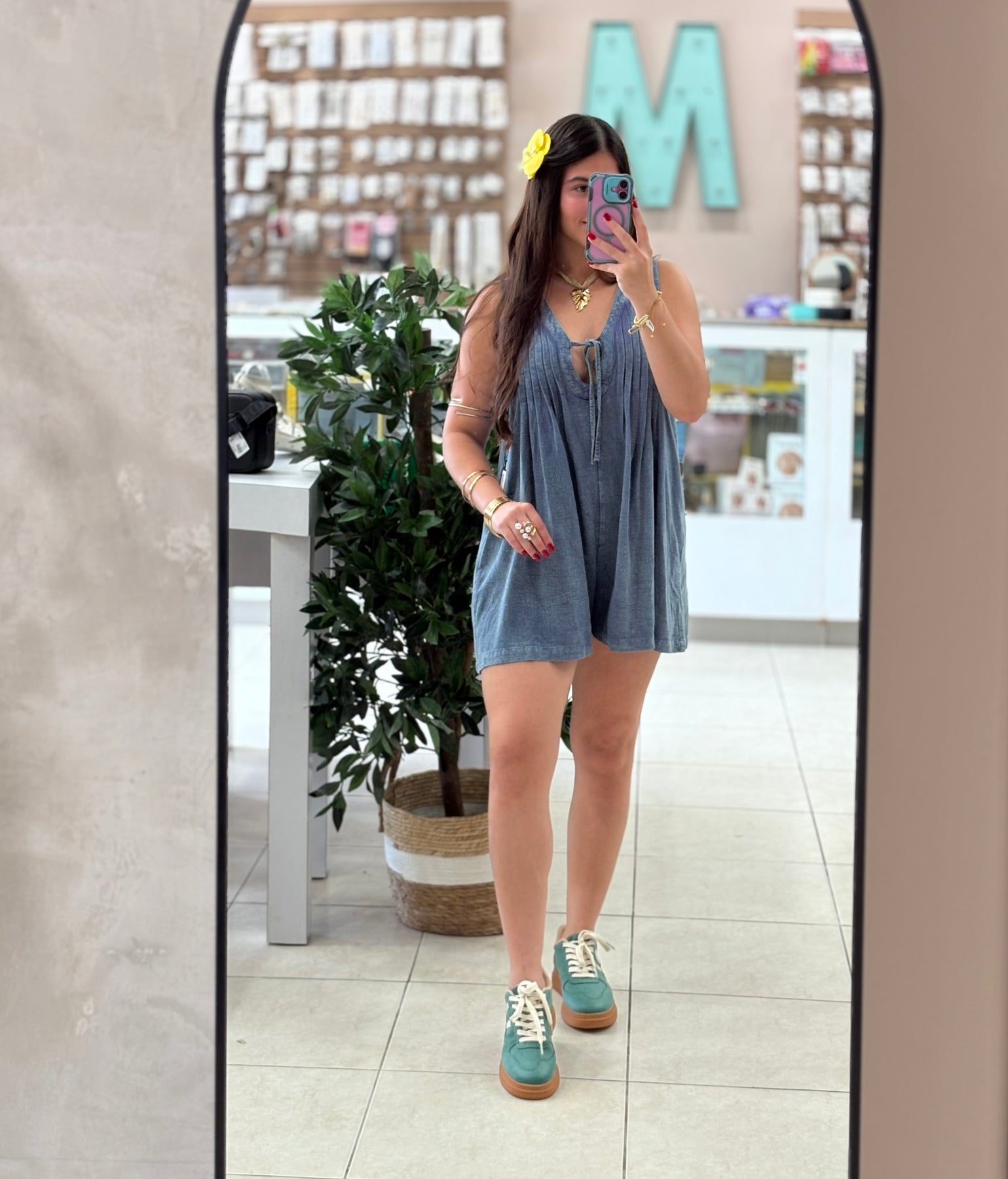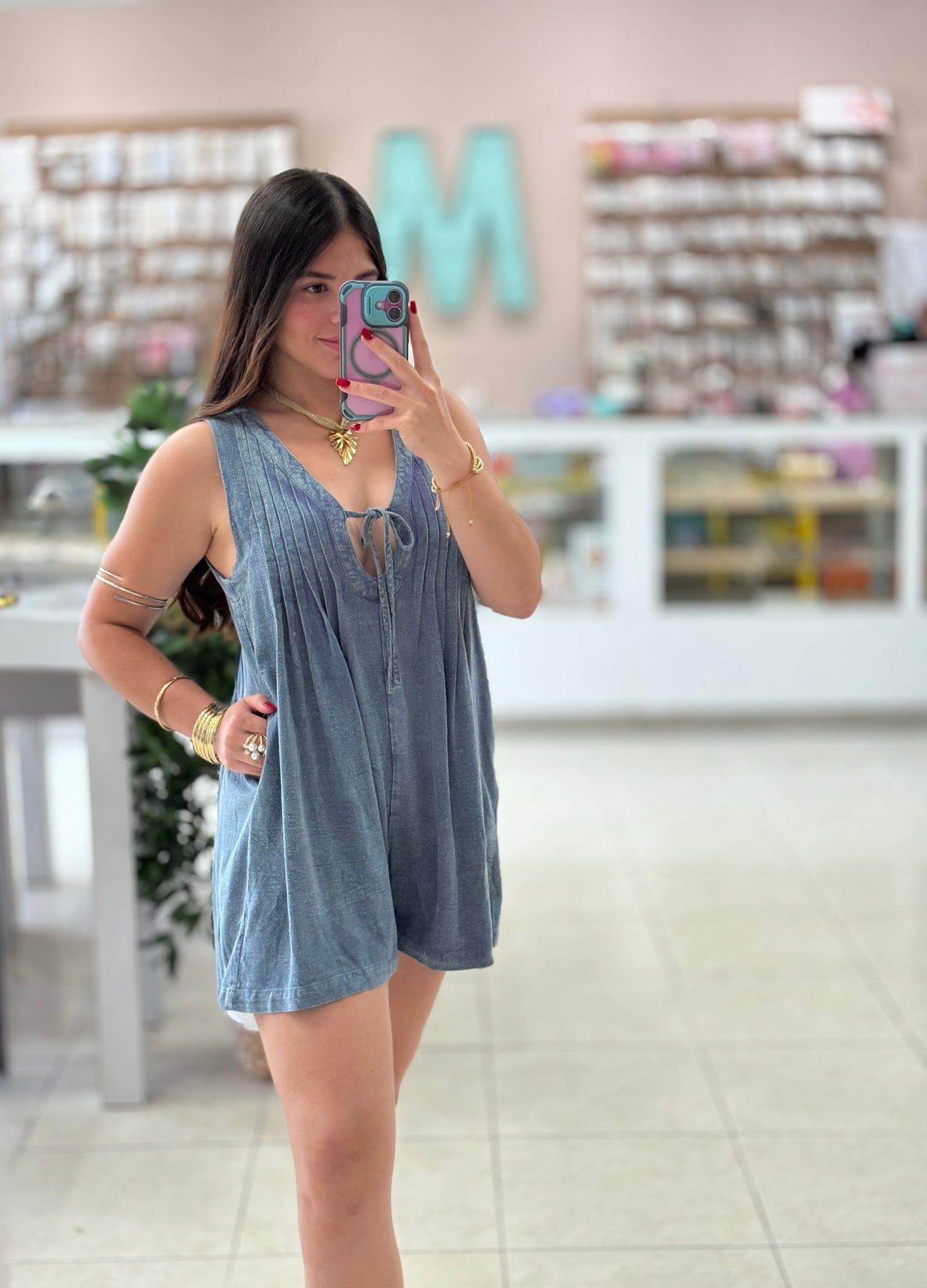 Be effortlessly stylish in our washed denim pleated romper. Made with high-quality denim fabric, this romper will keep you comfortable and chic all day long. Perfect for any occasion, this romper is a must-have in your wardrobe.
