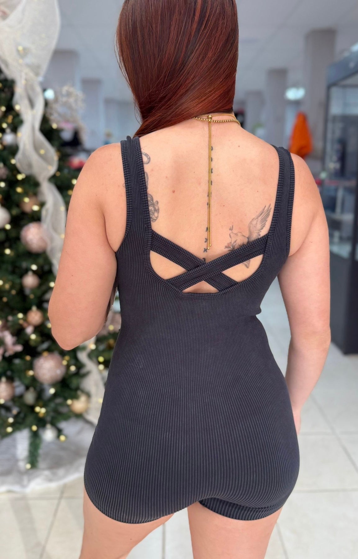 This versatile Xback Romper in washed black is designed with an x back for a unique, stylish touch. With its one size option, it offers a comfortable and flattering fit for anyone. Perfect for any occasion, this romper is a must-have addition to your wardrobe.