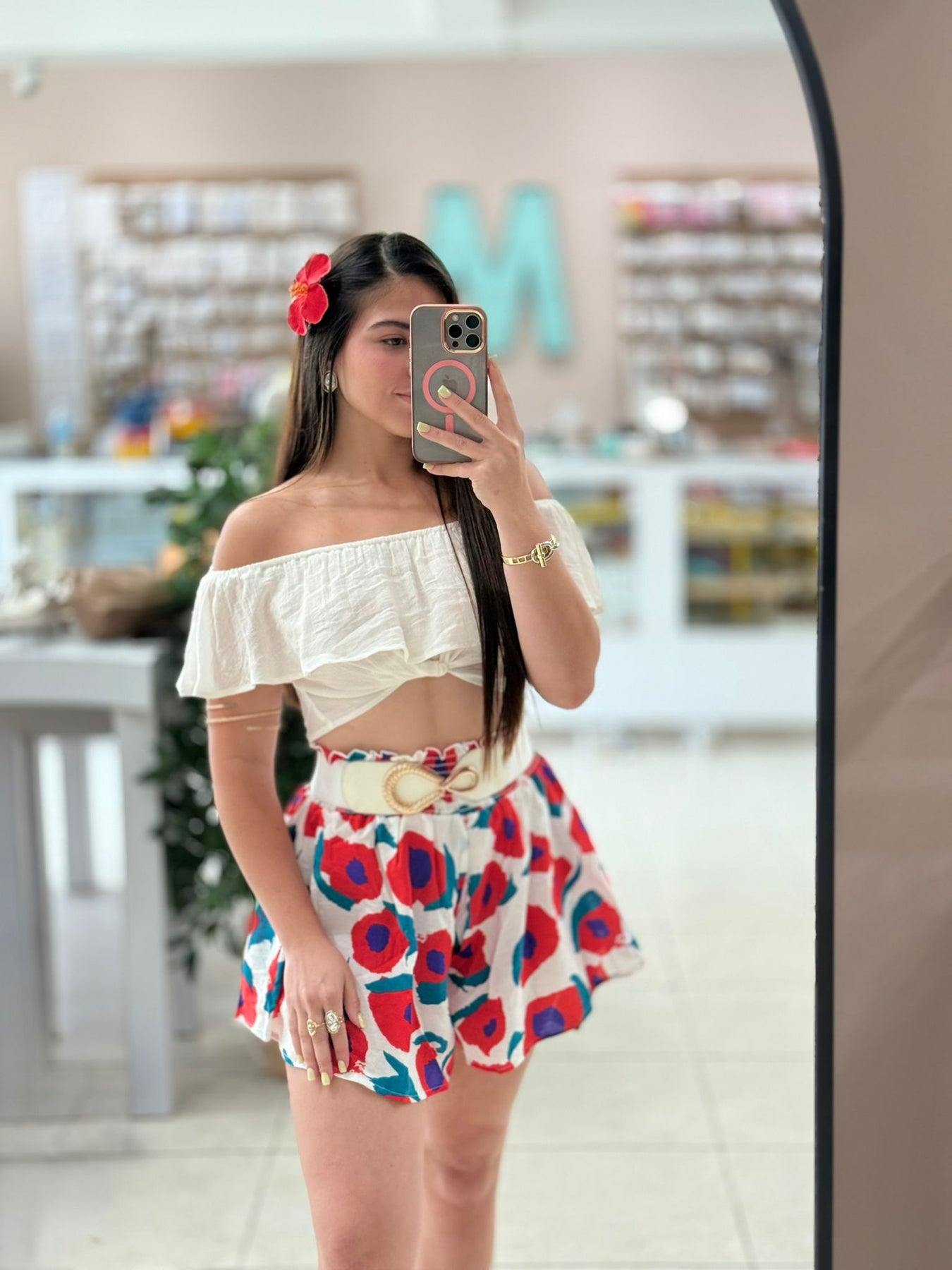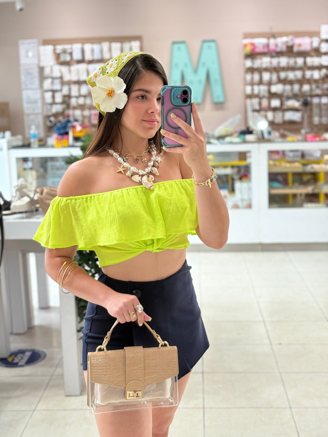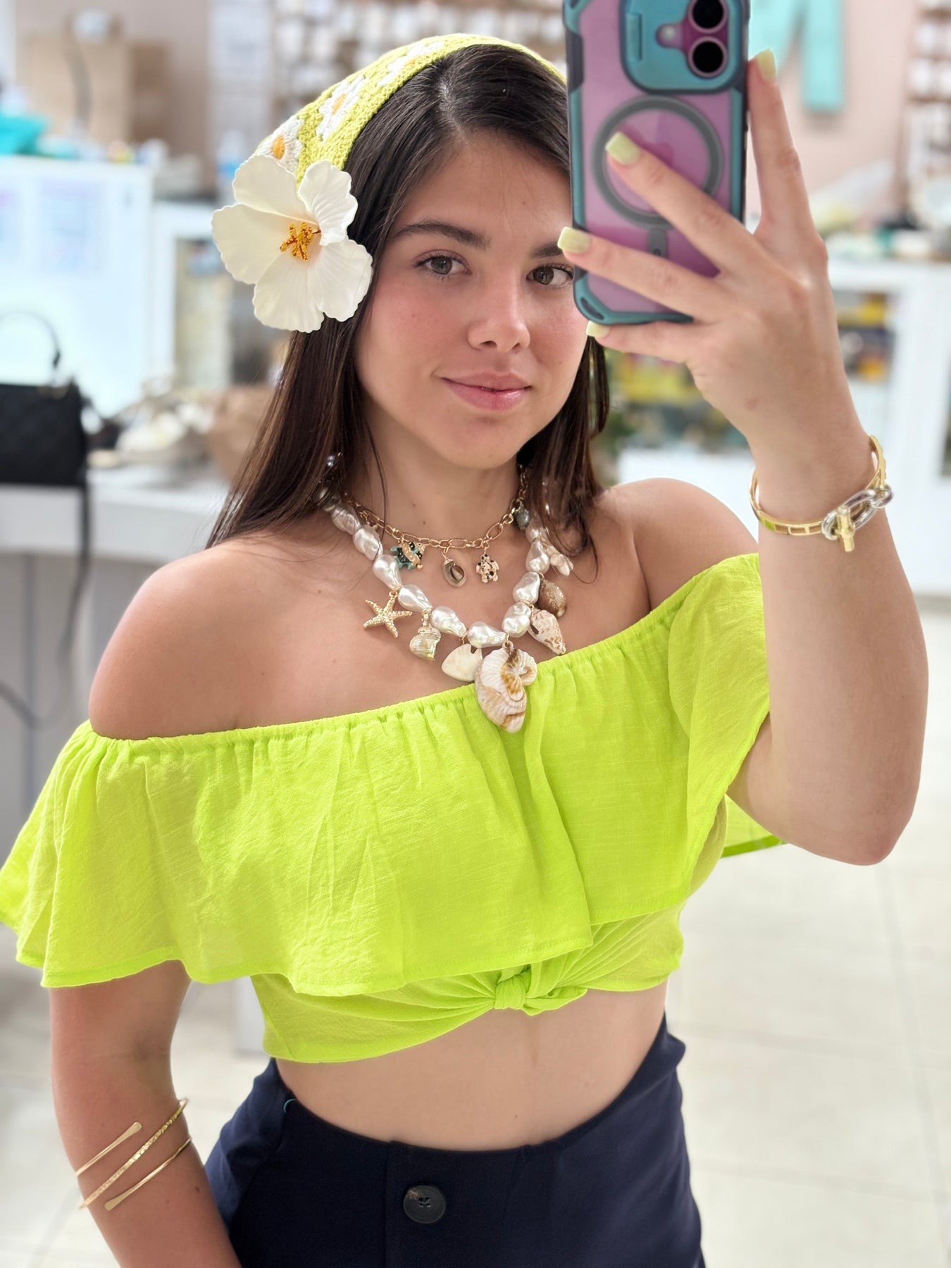 Capture effortless vacation vibes in our Breezy Ruffle Tie-Front Crop Top, a flirty essential made for sun-drenched days and warm tropical escapes. This airy, lightweight top features a flattering off-the-shoulder neckline with soft flutter sleeves and a charming self-tie front detail that adds a playful twist.