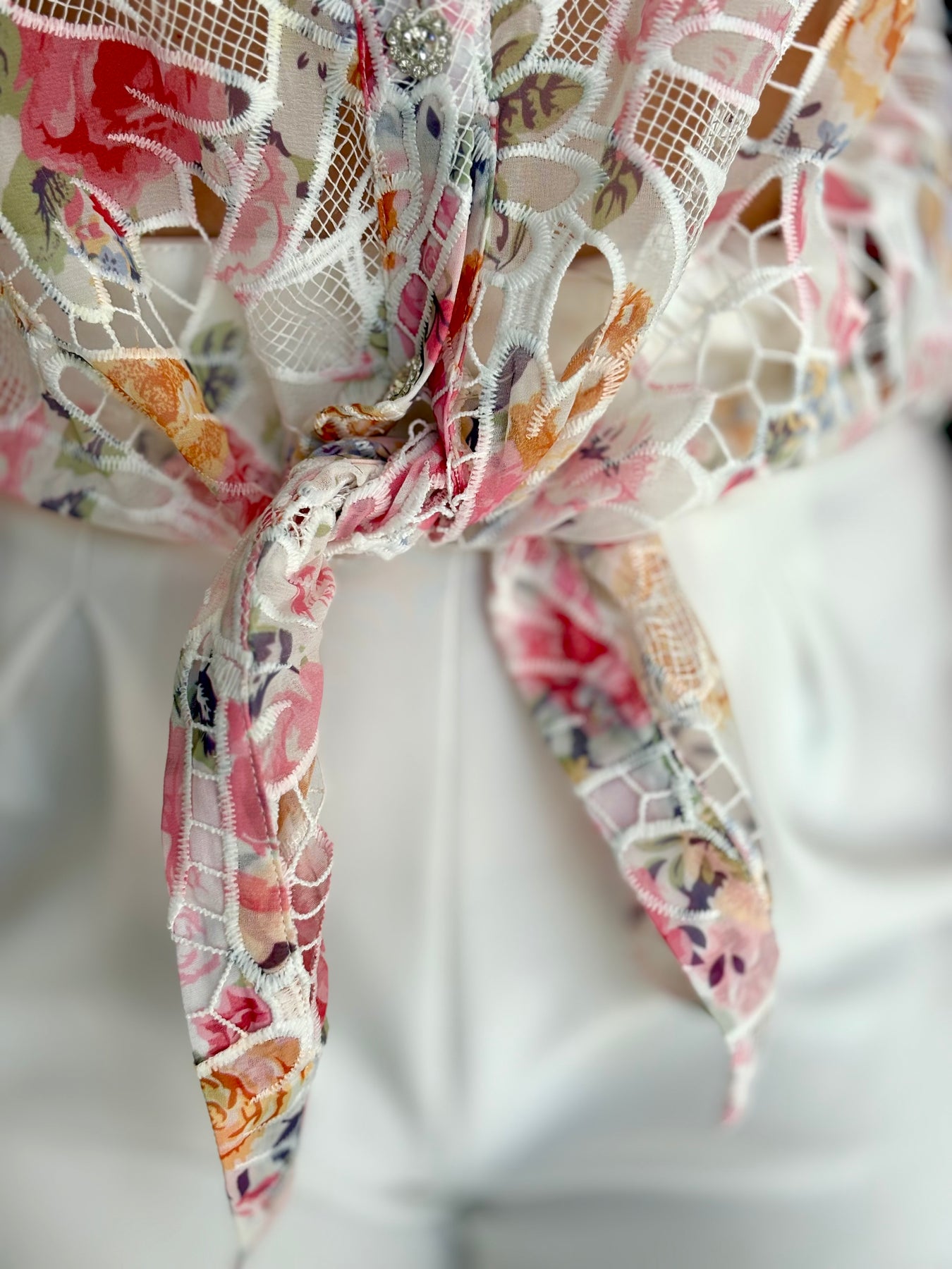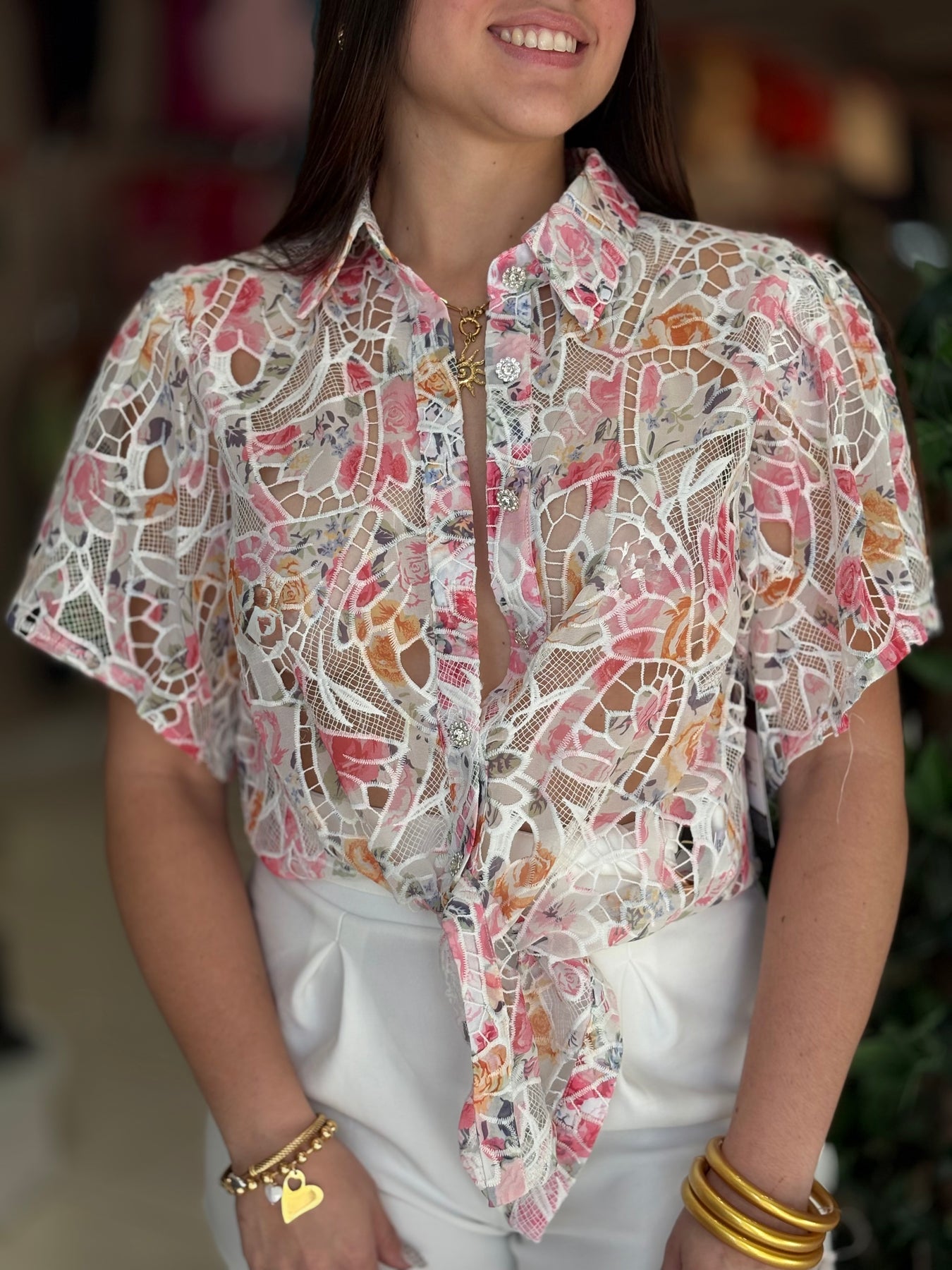 Experience the feminine grace of our Jadore Shirt! Featuring a delicate crochet lace design and a beautiful floral print, this short sleeve button down shirt is the epitome of elegance and style. Its versatility and comfort make it a must-have addition to any wardrobe. Elevate your look today!