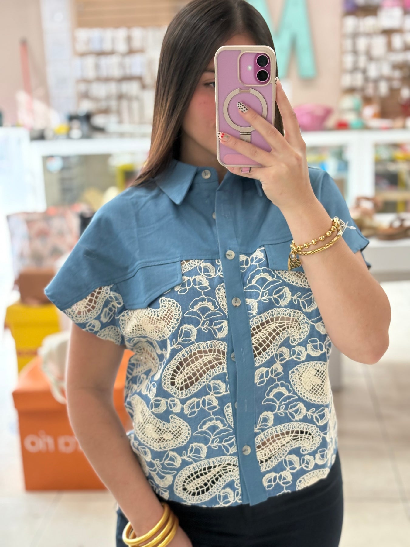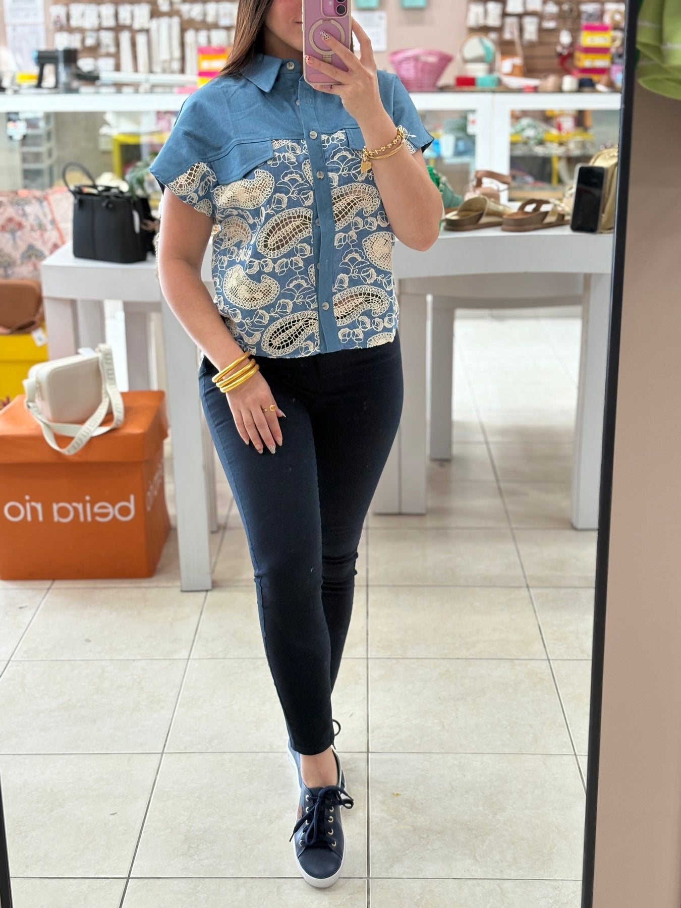 Elevate your style with our Paisley Denim Top! This Hermosa top features stunning ivory crichet paisley details for a touch of elegance and charm. Perfect for any occasion, this top effortlessly combines comfort and sophistication. Upgrade your wardrobe today with our Paisley Denim Top!