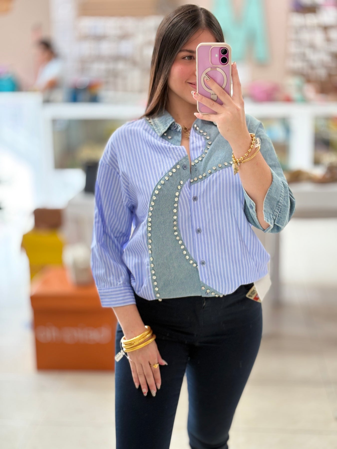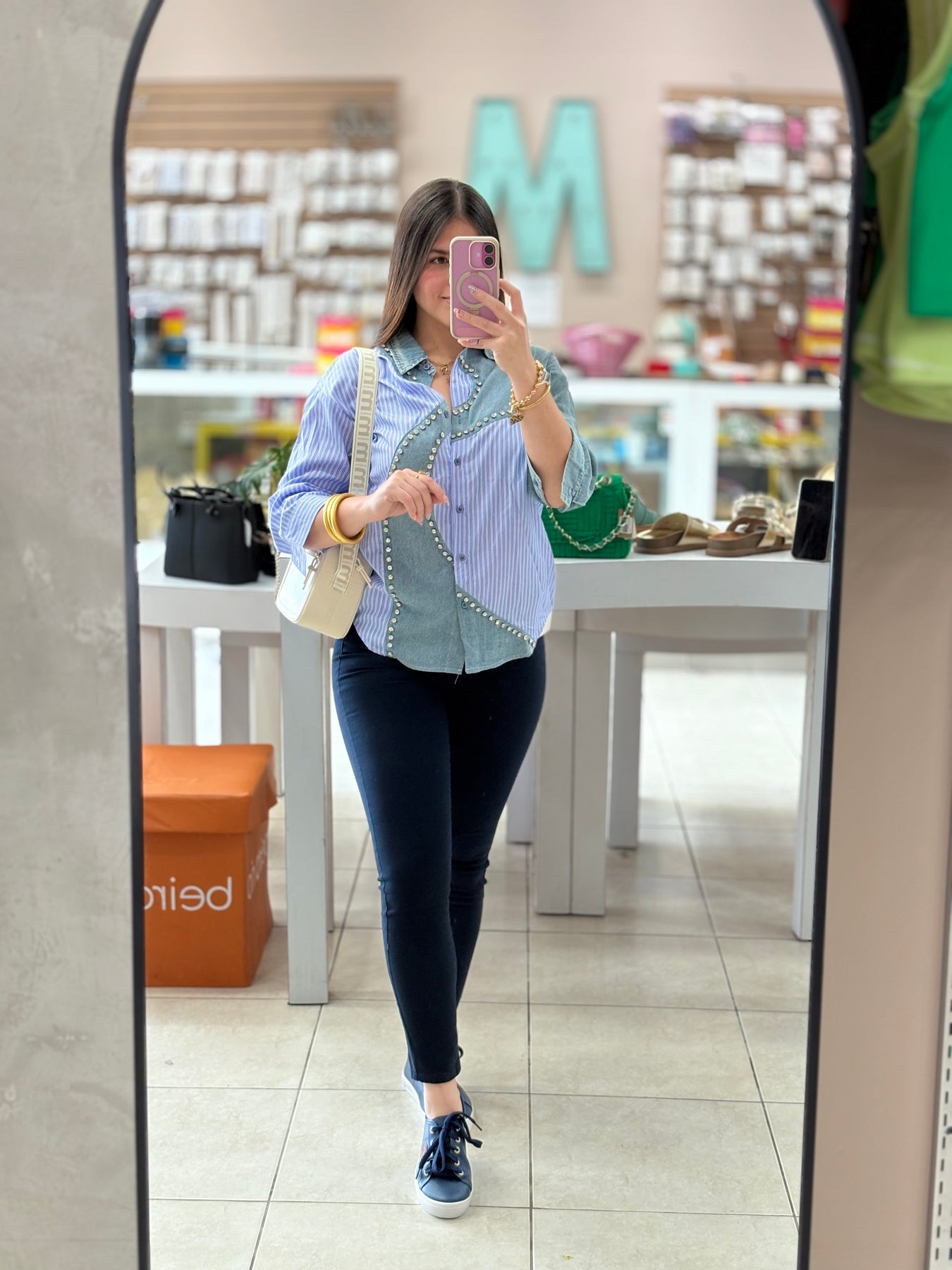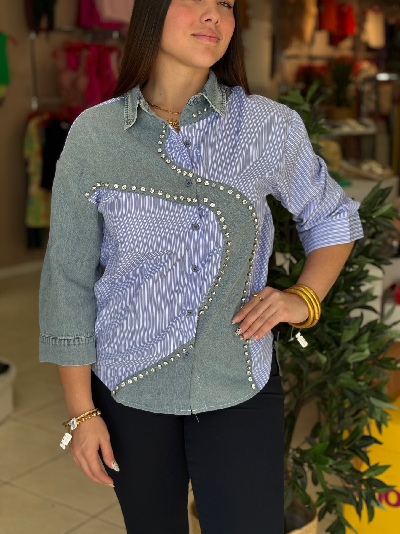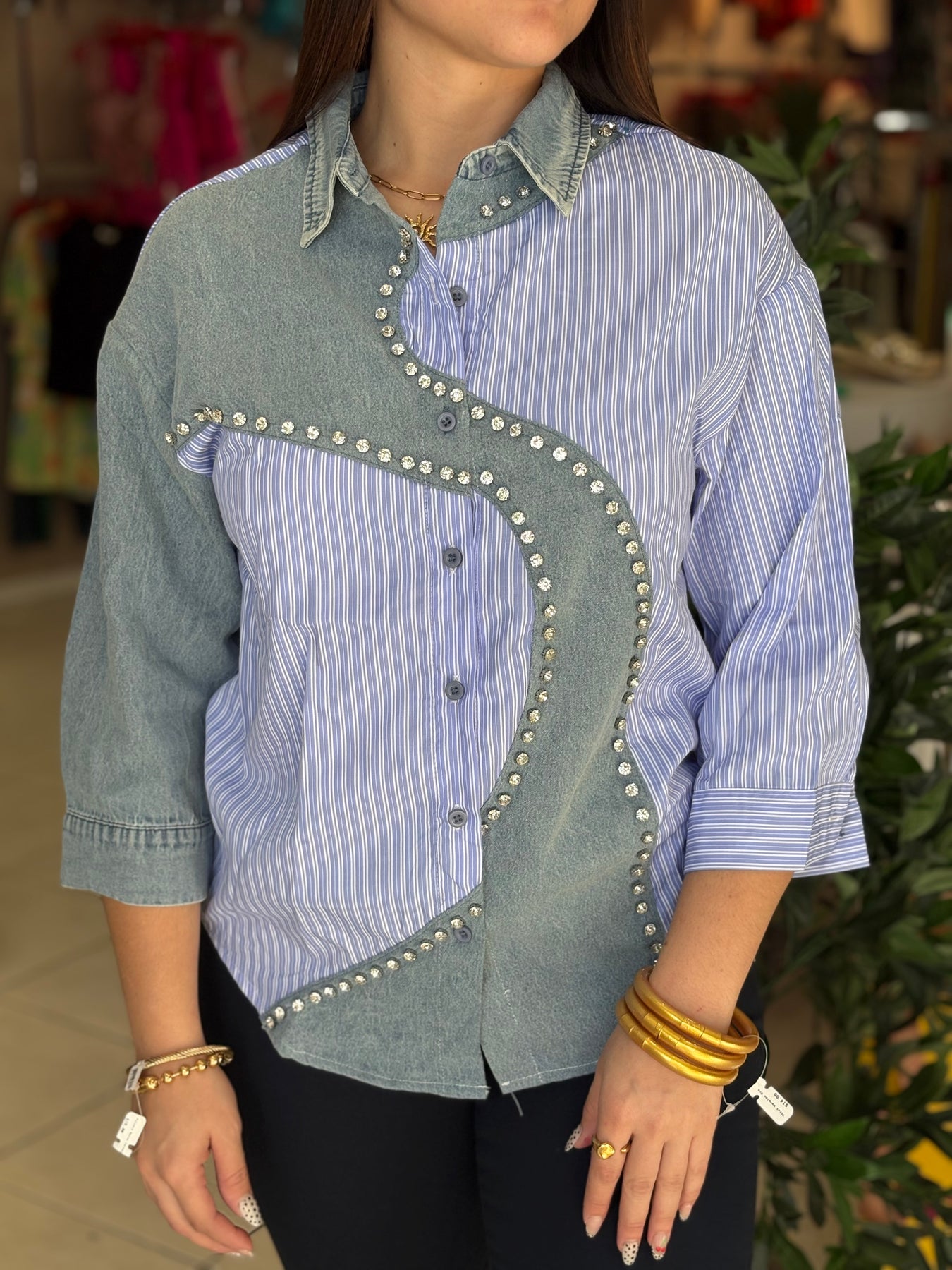Elevate your wardrobe with our Path Stripes Shirt! This stylish button down features 3/4 sleeves, suede accents, and dazzling rhinestones. Tantalizing stripes add a touch of sophistication. Feel confident and chic in this unique and trendy piece. Perfect for any occasion, inspire fashion envy wherever you go!