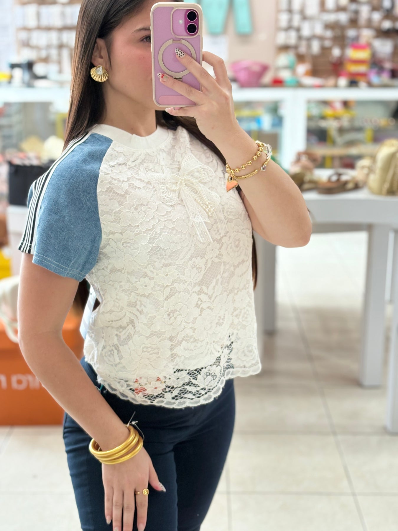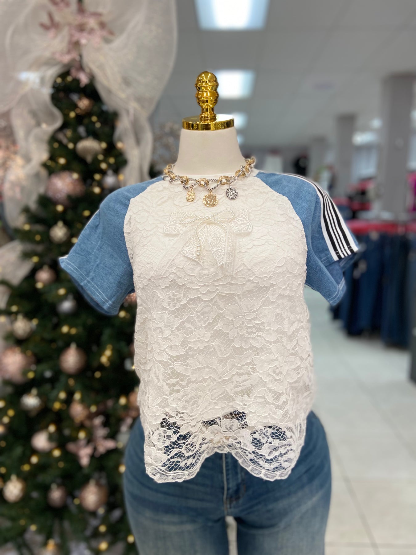 Introducing the Patsy Top - the perfect combination of sporty and chic. Made with delicate lace and durable denim, this top is perfect for any active lifestyle. Elevate your look and stay comfortable all day long with the Patsy Top!