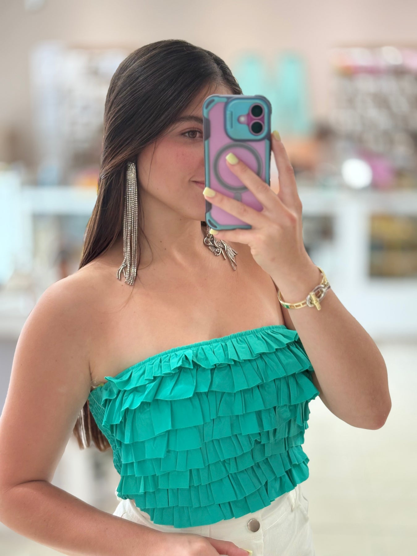 This ruffle tube top features a stylish design with front eyelets and a smocked back for a comfortable fit. Perfect for any occasion, this top will elevate your wardrobe and flatter your figure. Feel confident and stylish in this must-have piece!