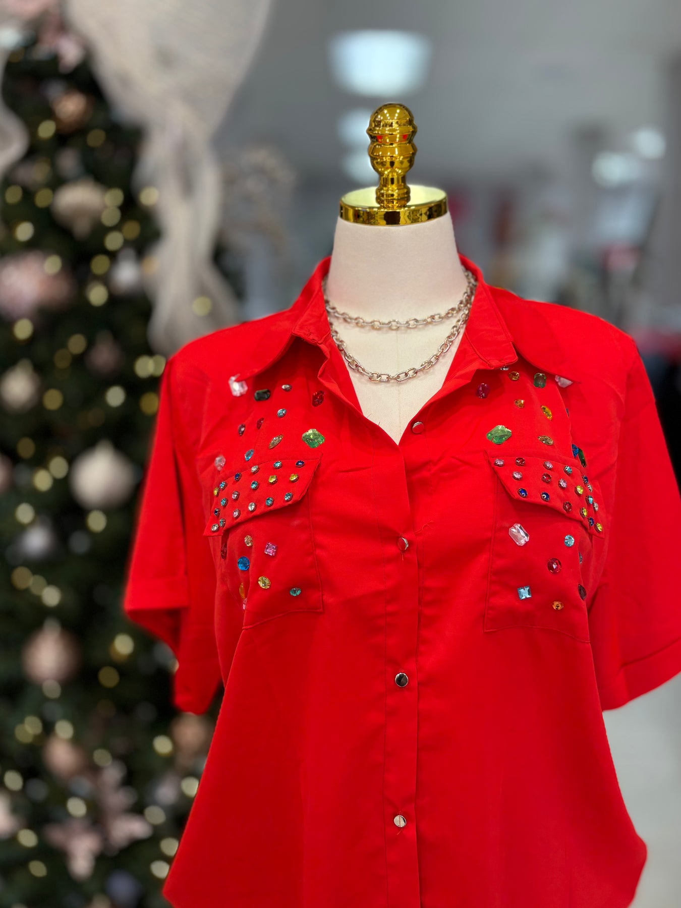 Elevate your style with our Aura Top! This beautiful top features colorful gemstone buttons and a flattering curvy fit. Make a statement with every wear and add a touch of luxury to your wardrobe. You'll love the way this top makes you look and feel!
