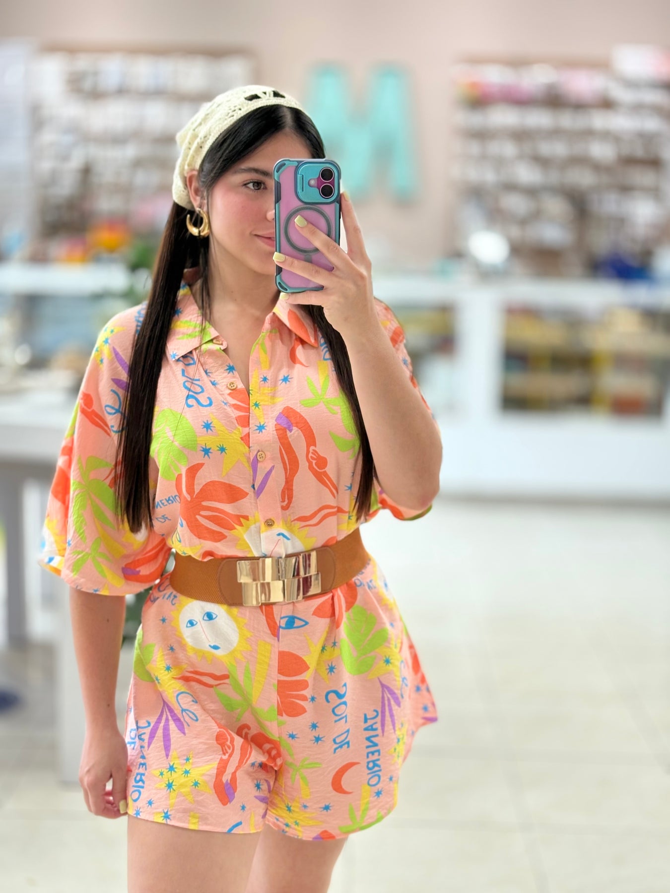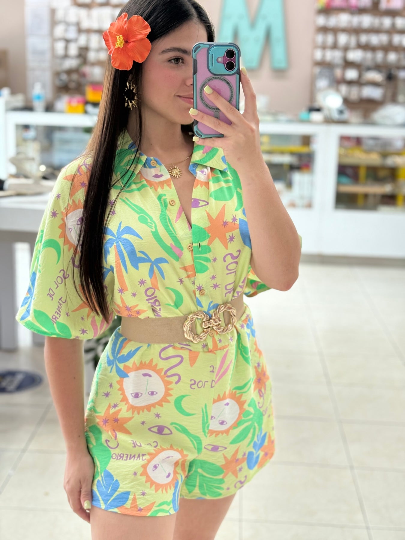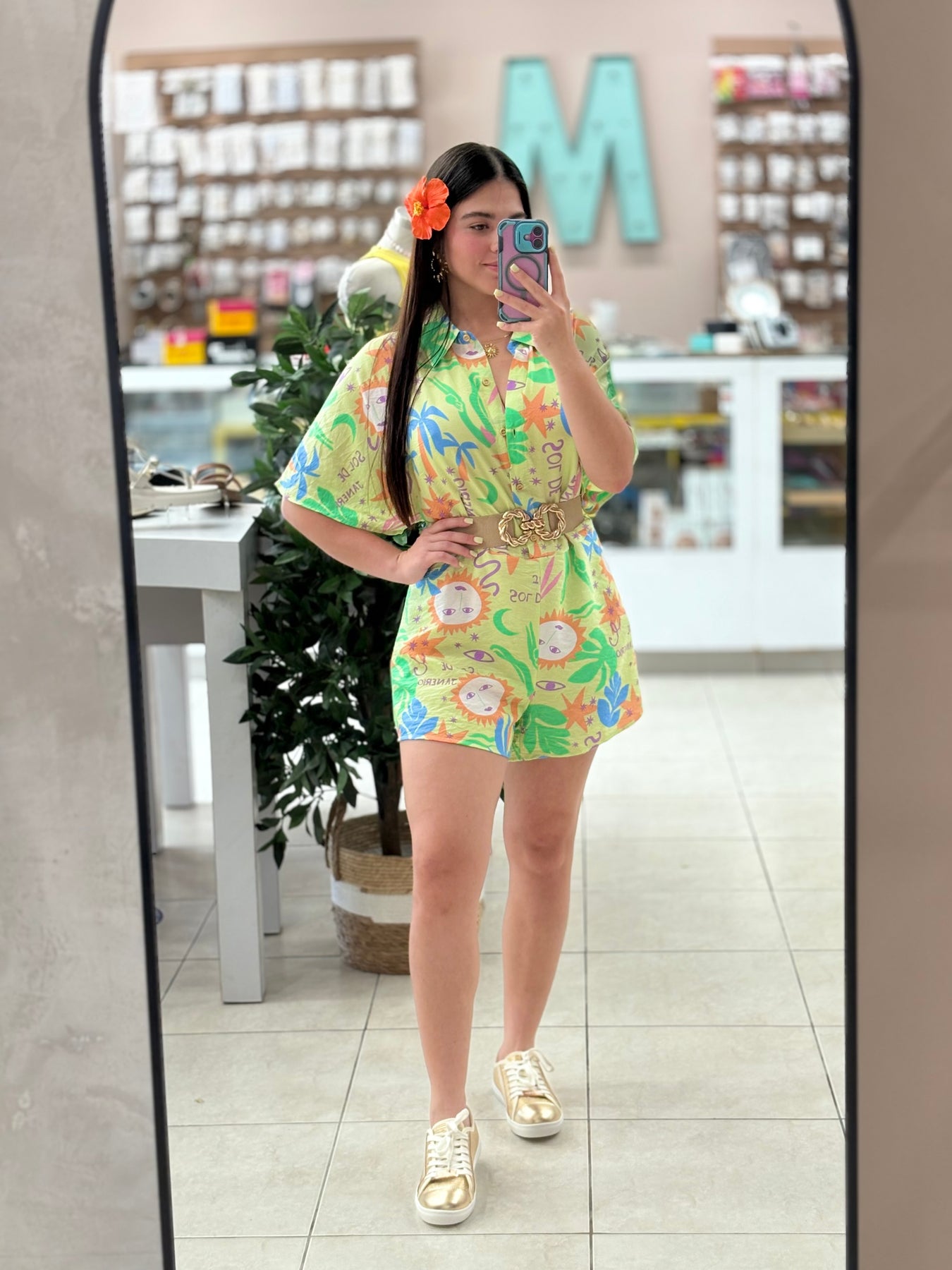 Effortles stylish Janeiro romper adds a pop of color to any wardrobe. Choose from two vibrant options: Green or orange. Stand out from the crowd in this oversized, printed design. Perfect for any occasion, this romper is a must-have for any fashion-forward individual.