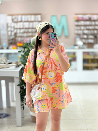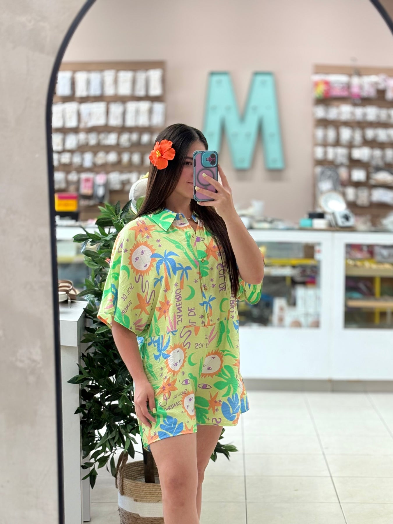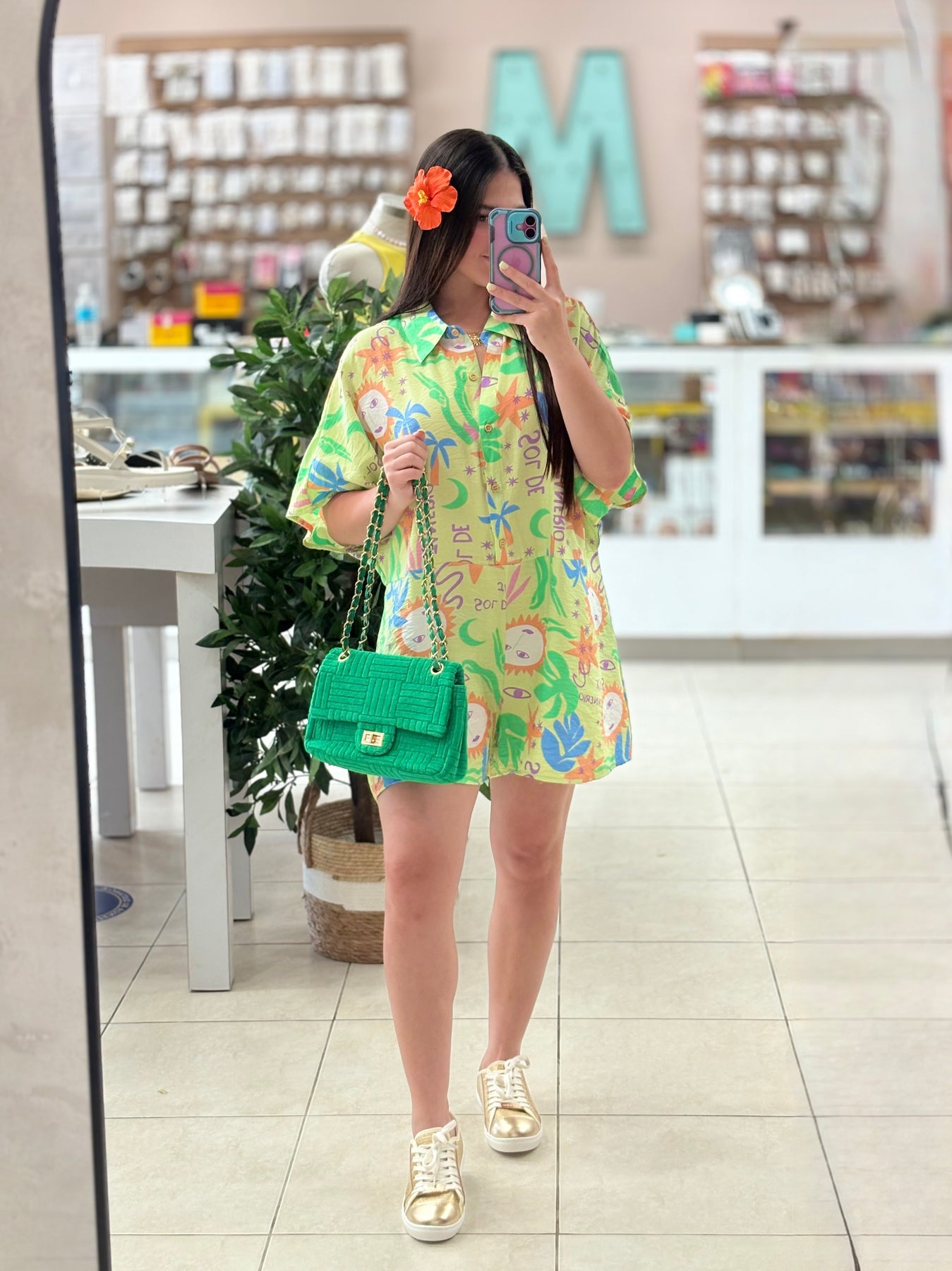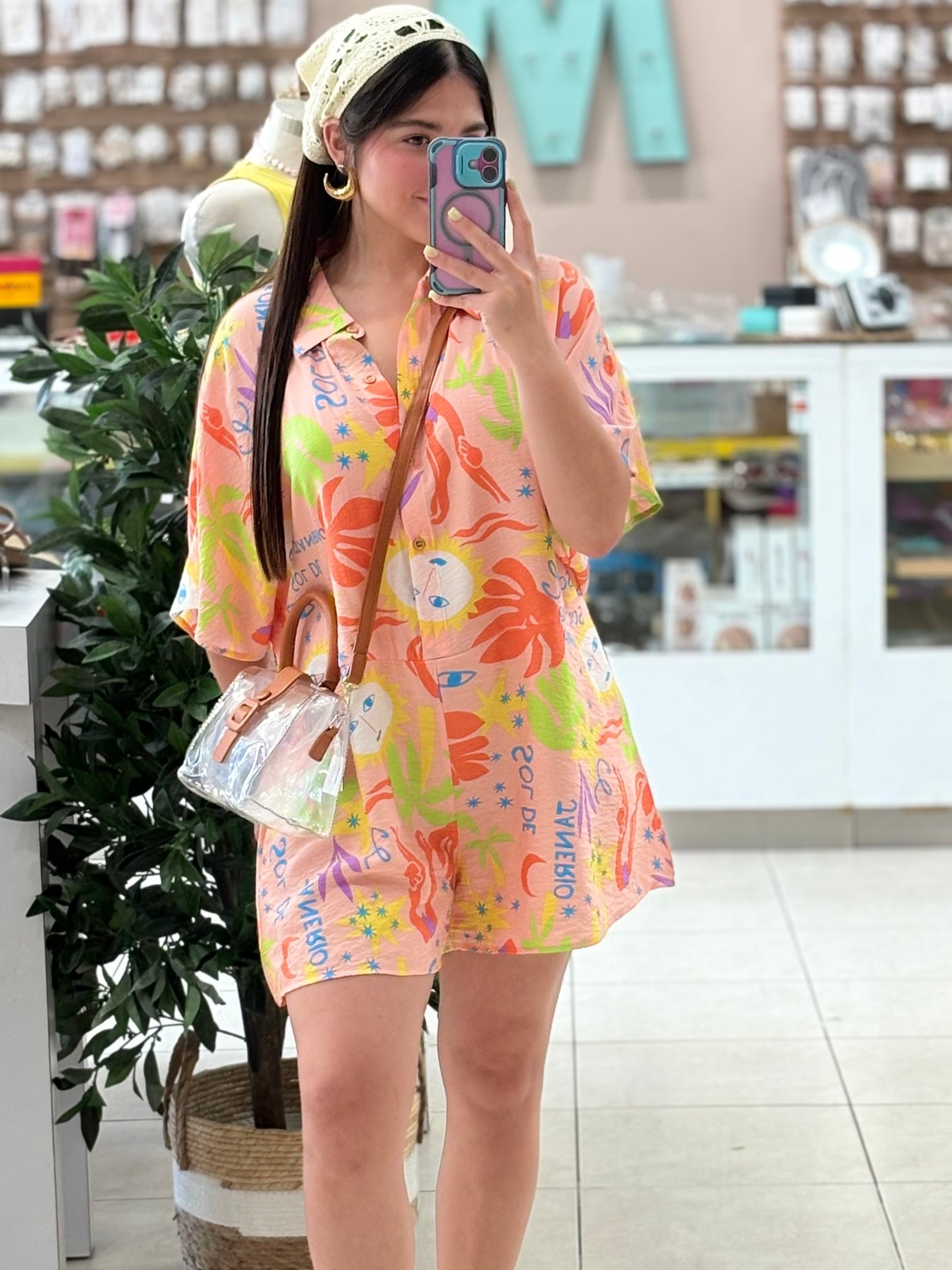 Effortles stylish Janeiro romper adds a pop of color to any wardrobe. Choose from two vibrant options: Green or orange. Stand out from the crowd in this oversized, printed design. Perfect for any occasion, this romper is a must-have for any fashion-forward individual.