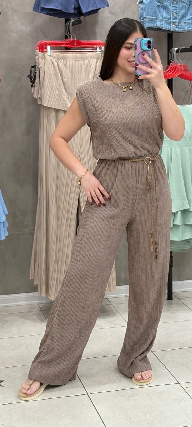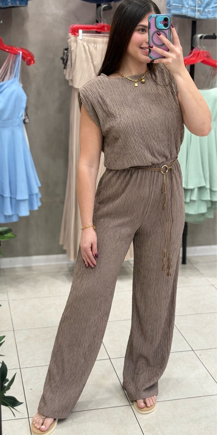 Elevate your style with this crinkle plisse jumpsuit, complete with a belt tie and shoulder pads. Perfect for any occasion, from dressy to casual.